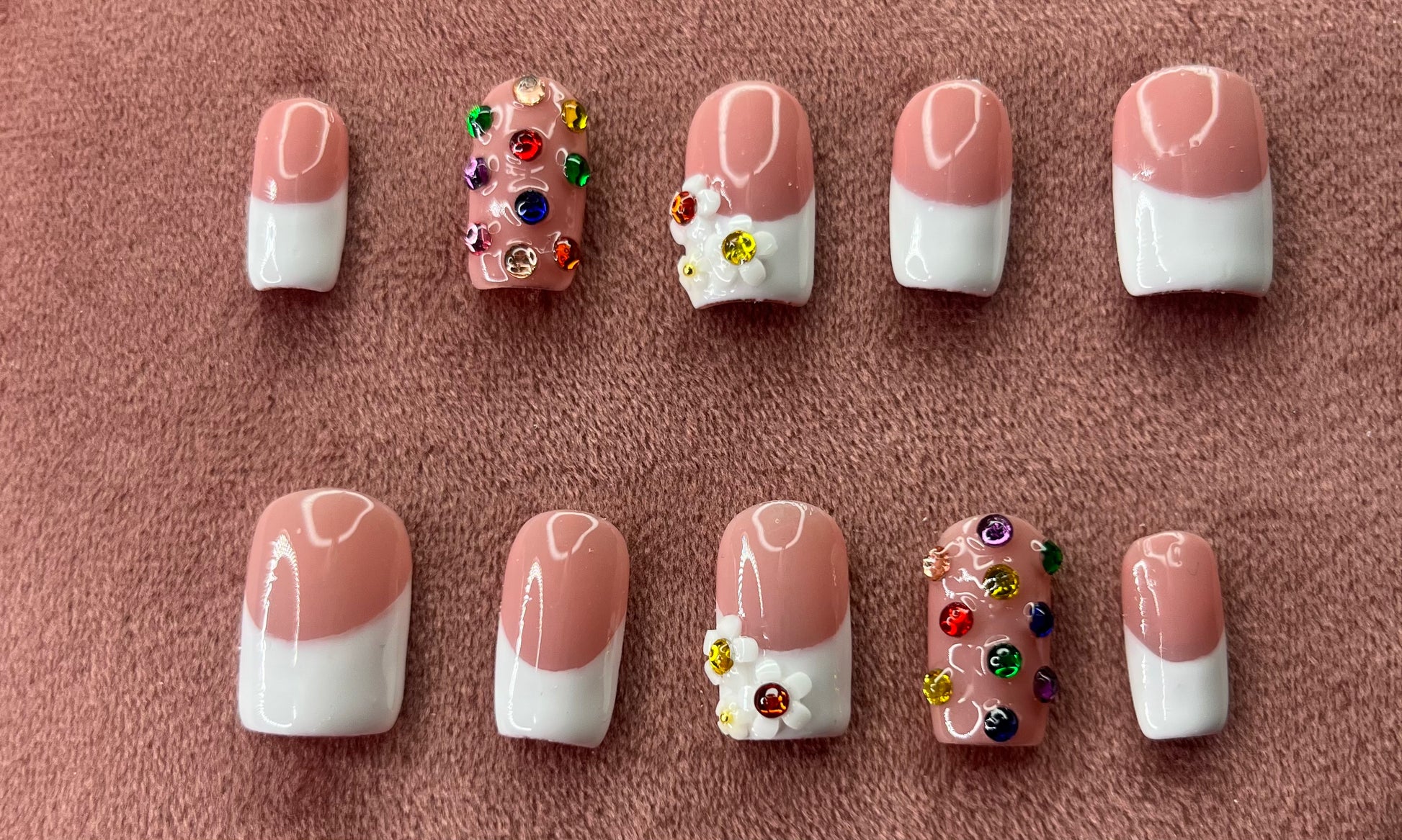 Petal Royale is a modern take on the classic French tip. Designed with a soft blush base and crisp white tips, this set is elevated with hand-placed floral accents and vibrant crystal details for a subtle yet eye-catching finish.